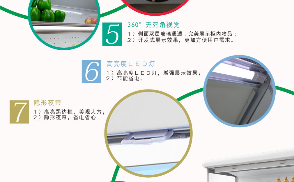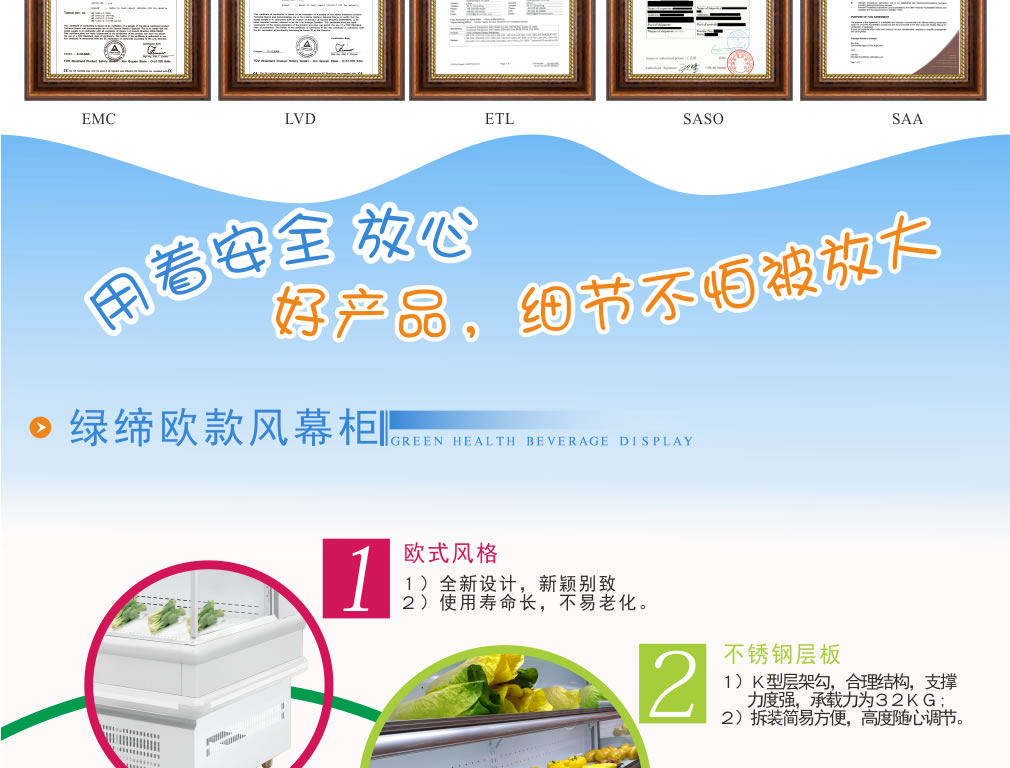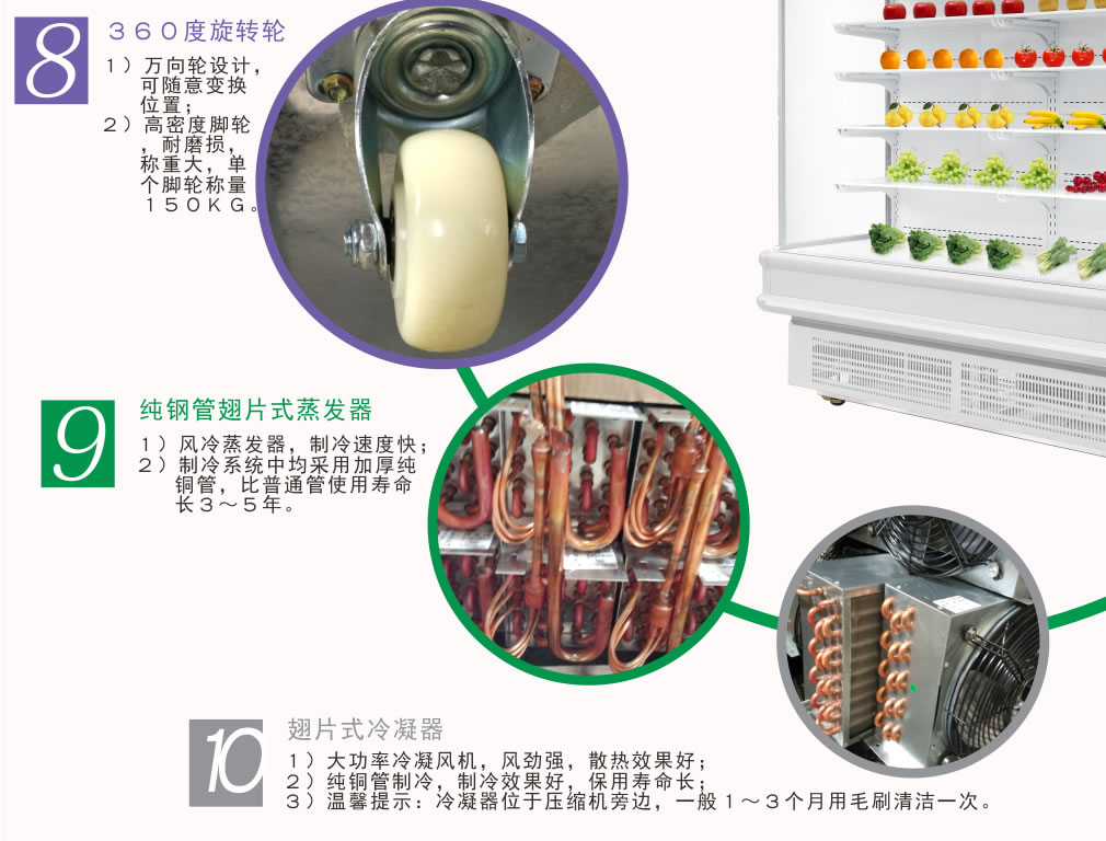 冷柜結(jié)構(gòu)緊湊,線條流暢,外觀豪華氣派,具有歐式風(fēng)格;非對(duì)稱渦流冷風(fēng)幕, 超大面積純銅管蒸發(fā)器,制冷更均勻,速度更快捷;流線型金屬邊條鑲嵌,不變形,耐腐蝕,外觀更顯豪