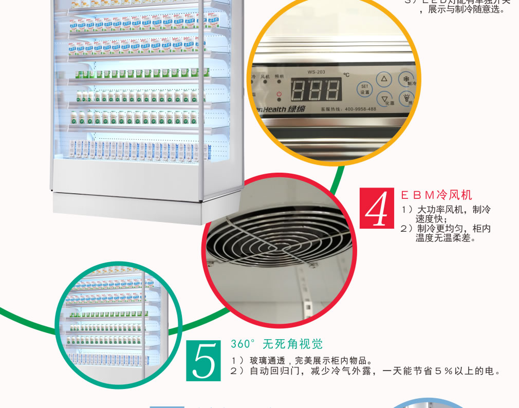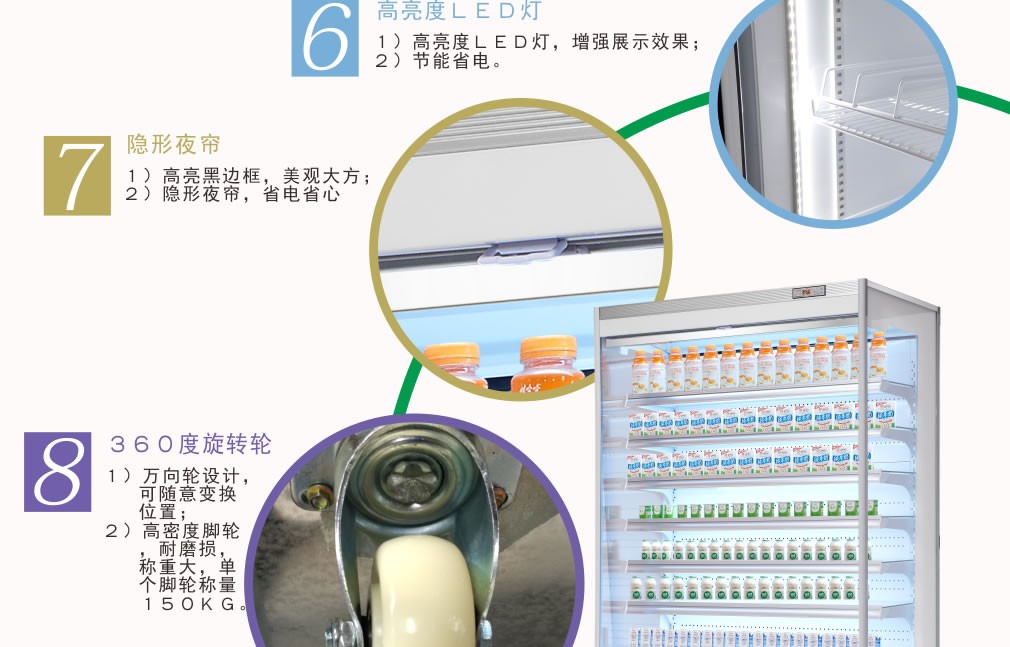 拉出式夜簾,LED燈管,多功能擱板,電腦溫控器,中空鋼化玻璃,不銹鋼內(nèi)膽,萬(wàn)向輪