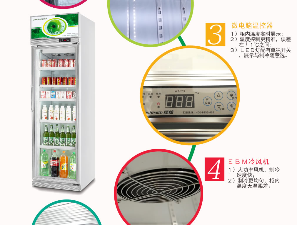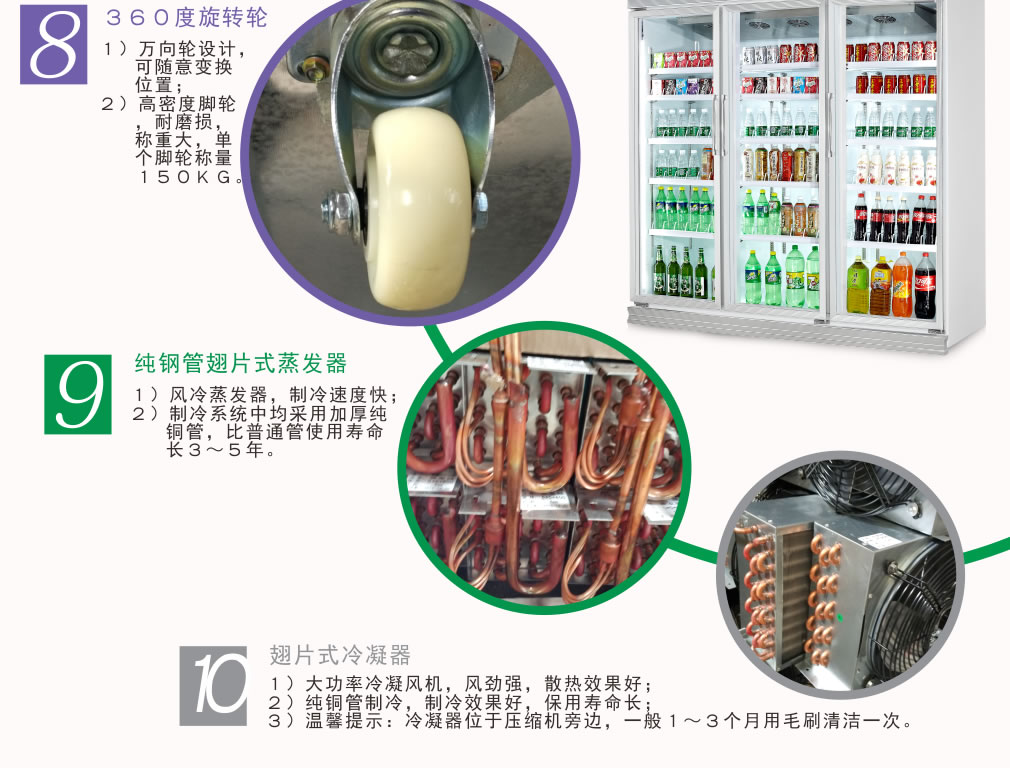 全封閉門封,不銹鋼層架勾,微電腦溫控器,EBM冷風(fēng)機(jī),高強(qiáng)度門鉸,高亮度LED燈,雙層中空玻璃門,360度旋轉(zhuǎn)輪,純鋼管翅片式蒸發(fā)器,翅片式冷凝器