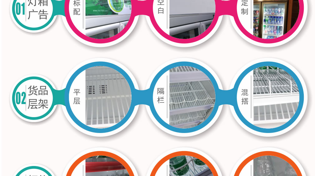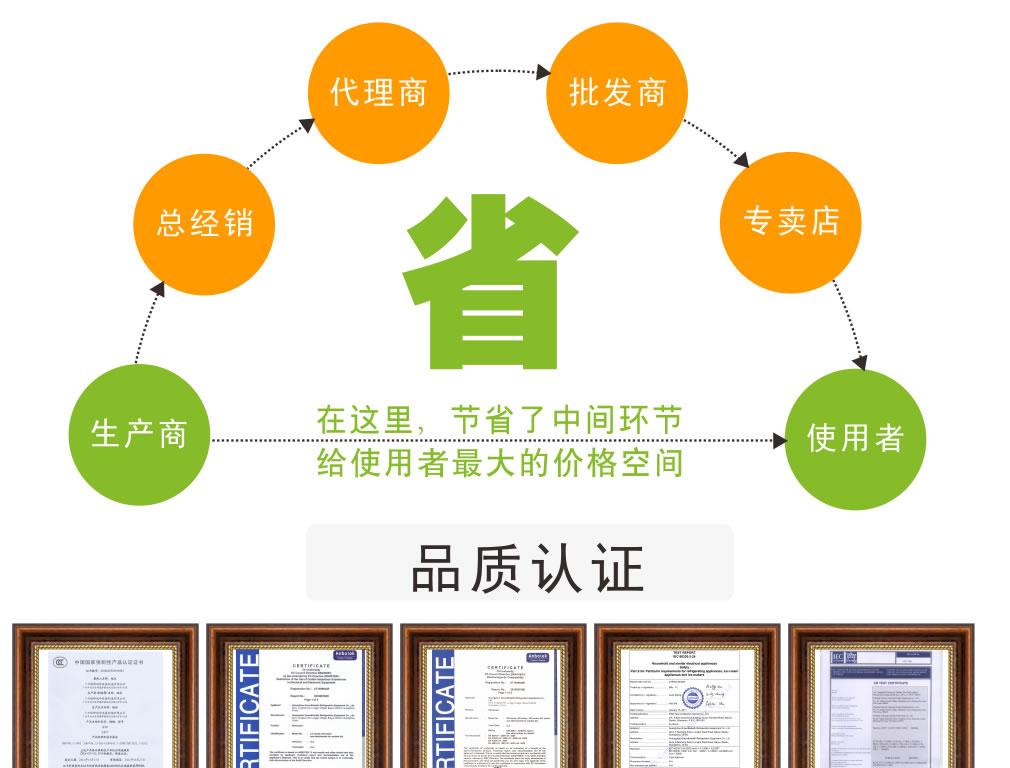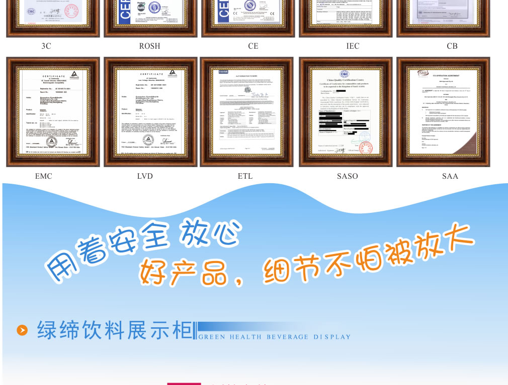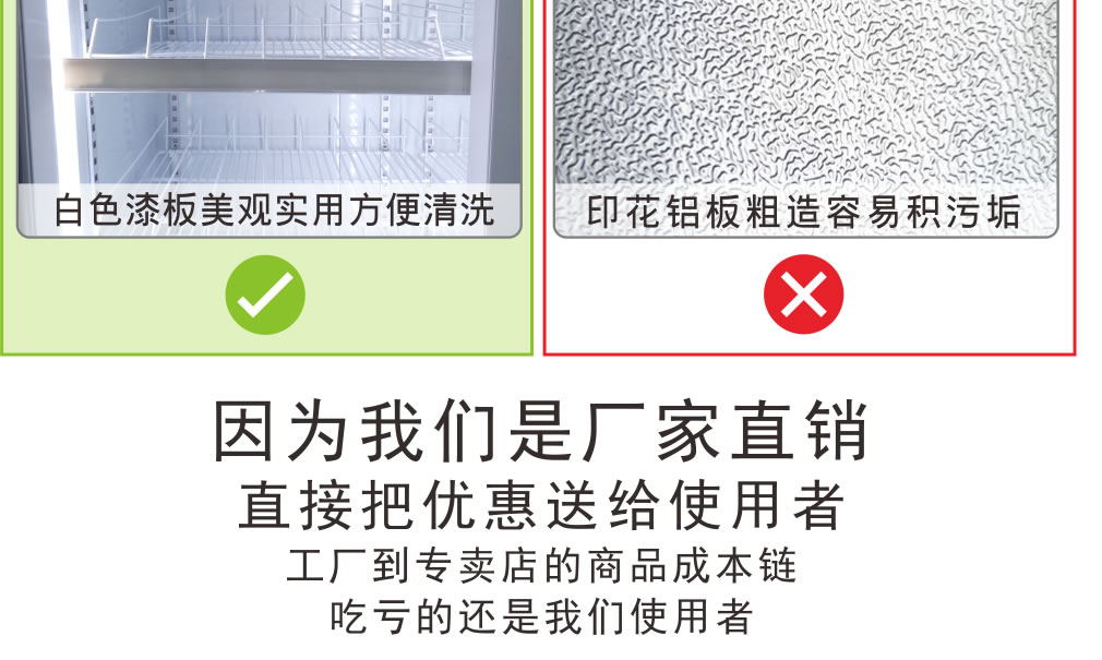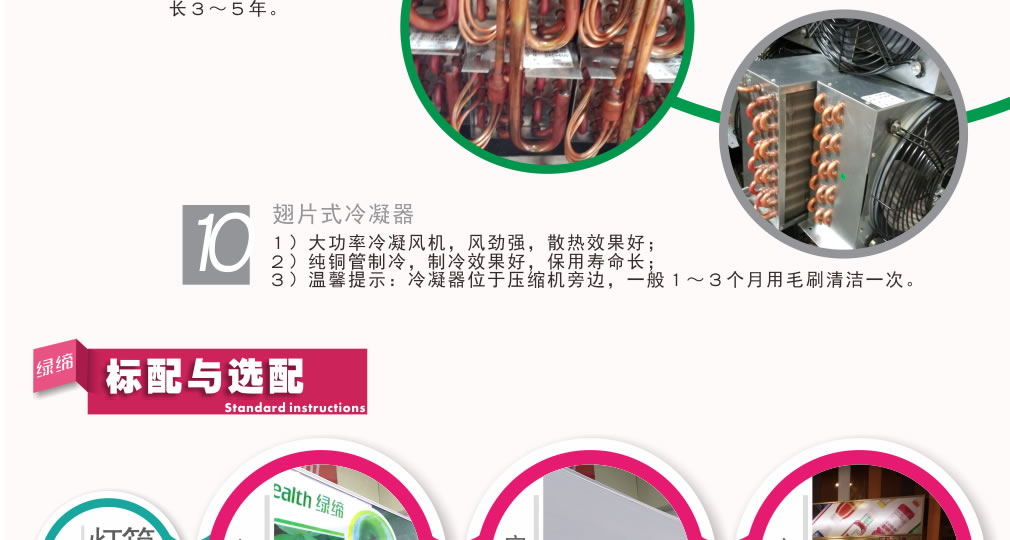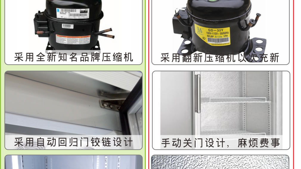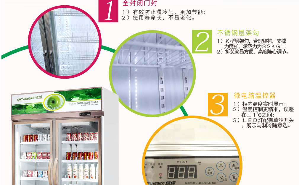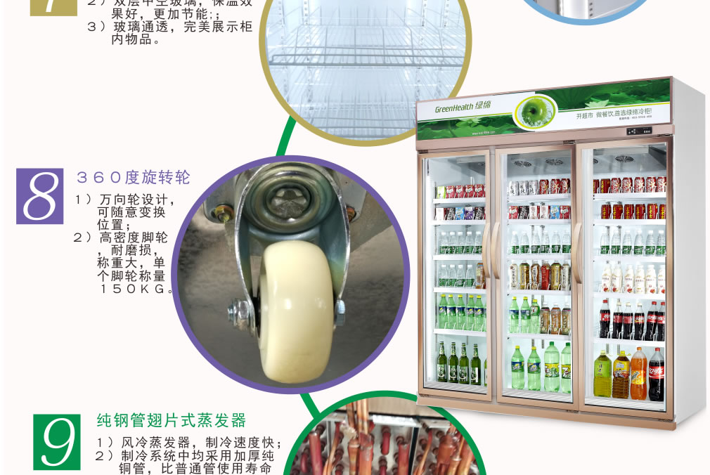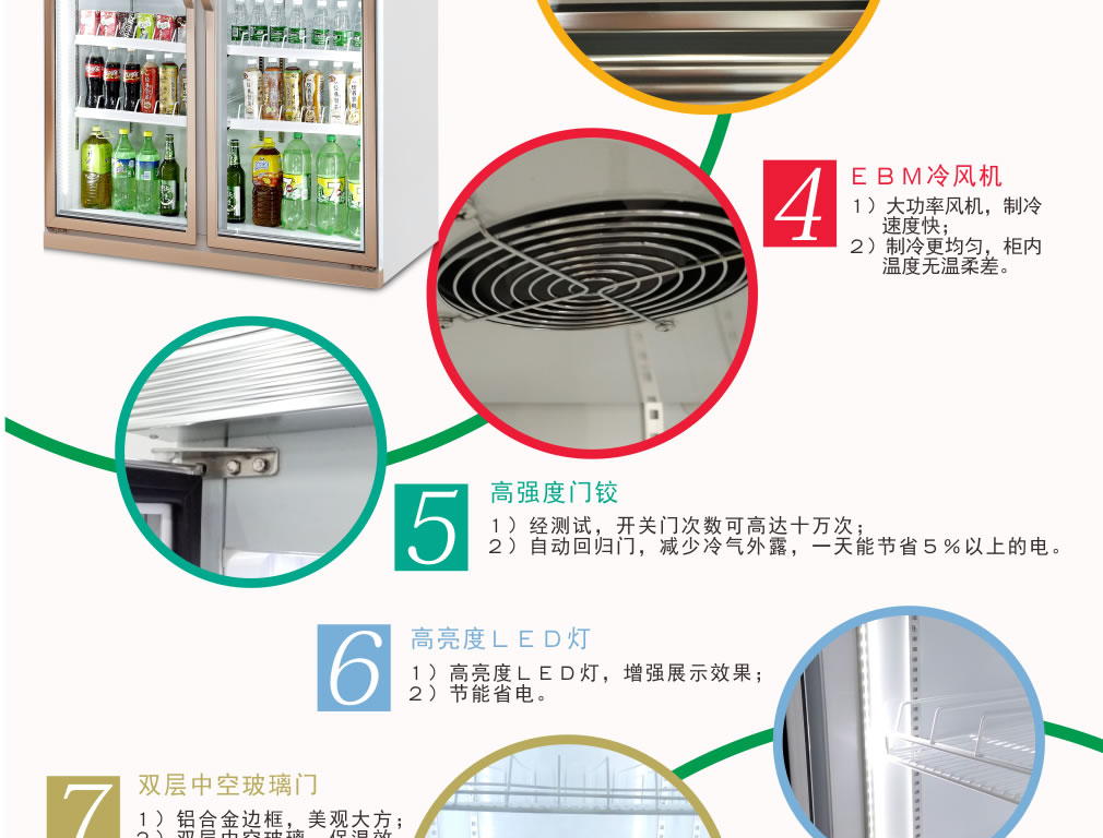 全封閉門封,不銹鋼層架勾,微電腦溫控器,EBM冷風(fēng)機(jī),高強(qiáng)度門鉸,高亮度LED燈,雙層中空玻璃門,360度旋轉(zhuǎn)輪,純鋼管翅片式蒸發(fā)器,翅片式冷凝器