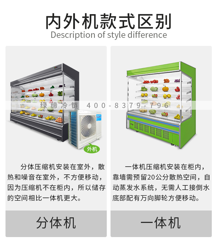 2、風(fēng)幕柜一體機機組在柜子本身, 就是直接插電就可以用,移動方便 。但一體機的噪音和熱量都在室內(nèi)。分體機就像我們用的空調(diào)一樣,壓縮機裝在室外,沒有噪音和熱量,但移動不方便,要安裝,費用高些。米數(shù)越長噪音和熱量越大,一般3米以上我們建議外機。