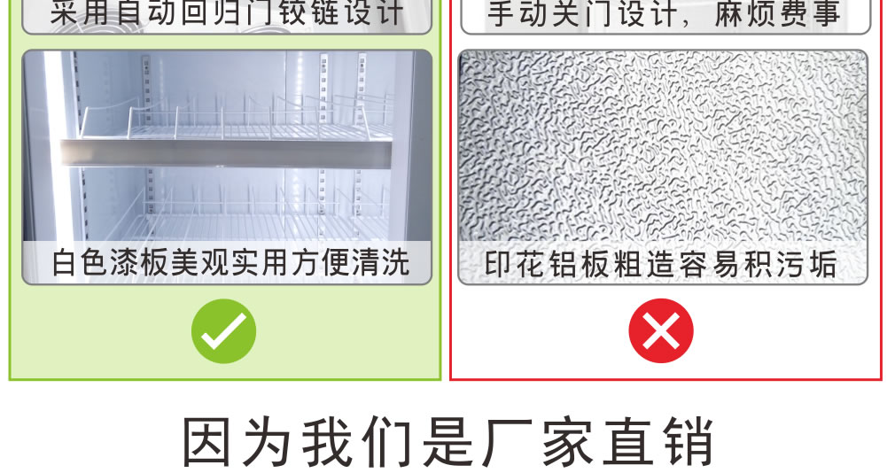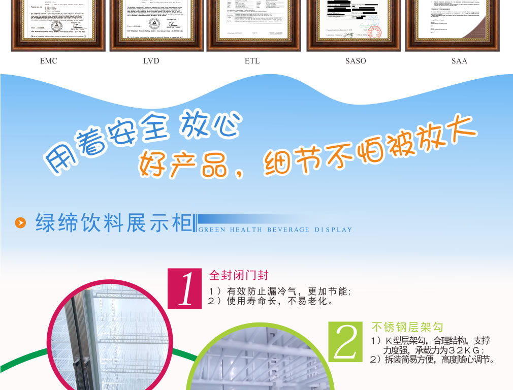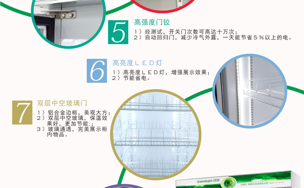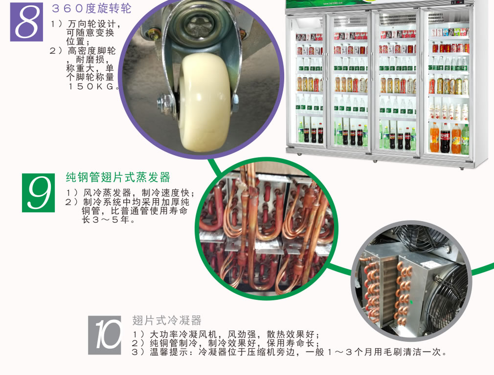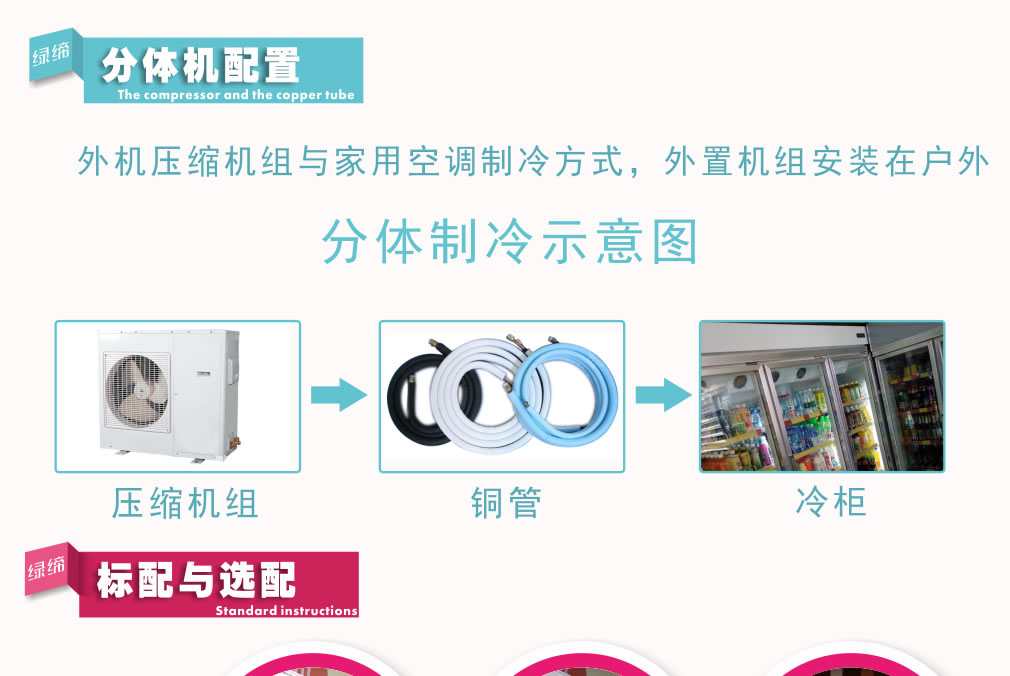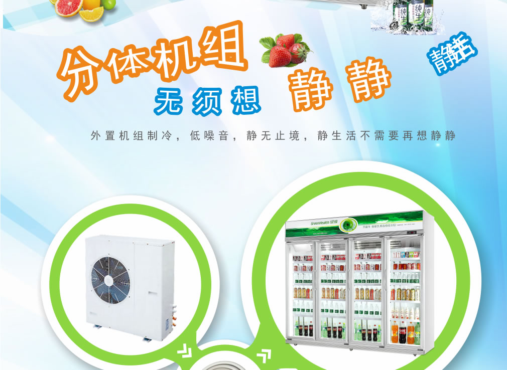分體式機組室內(nèi)噪音低,全封閉門封,不銹鋼層架勾,微電腦溫控器,EBM冷風(fēng)機,高強度門鉸,高亮度LED燈,雙層中空玻璃門,360度旋轉(zhuǎn)輪,純鋼管翅片式蒸發(fā)器,翅片式