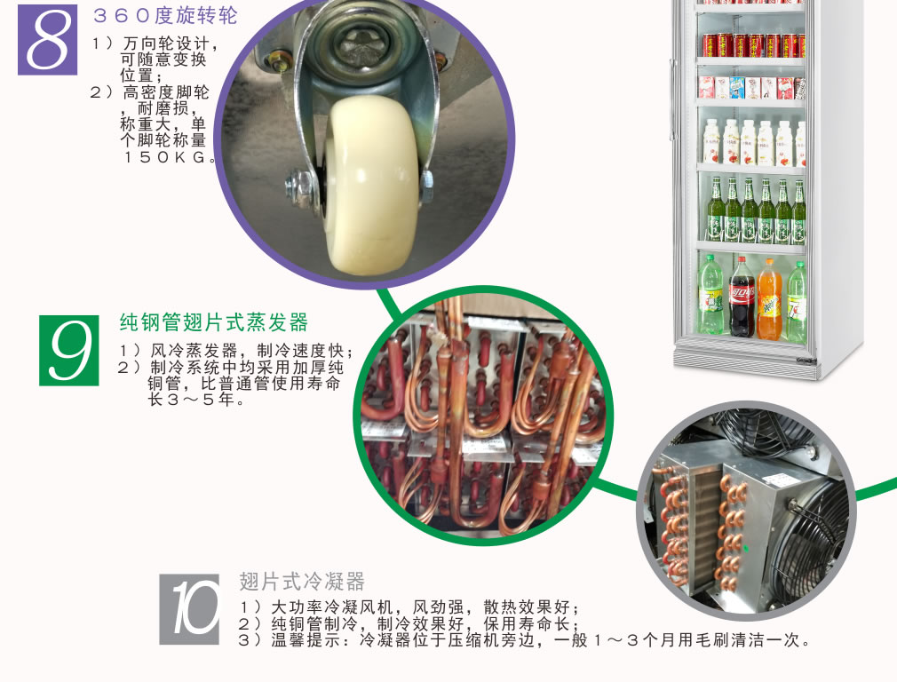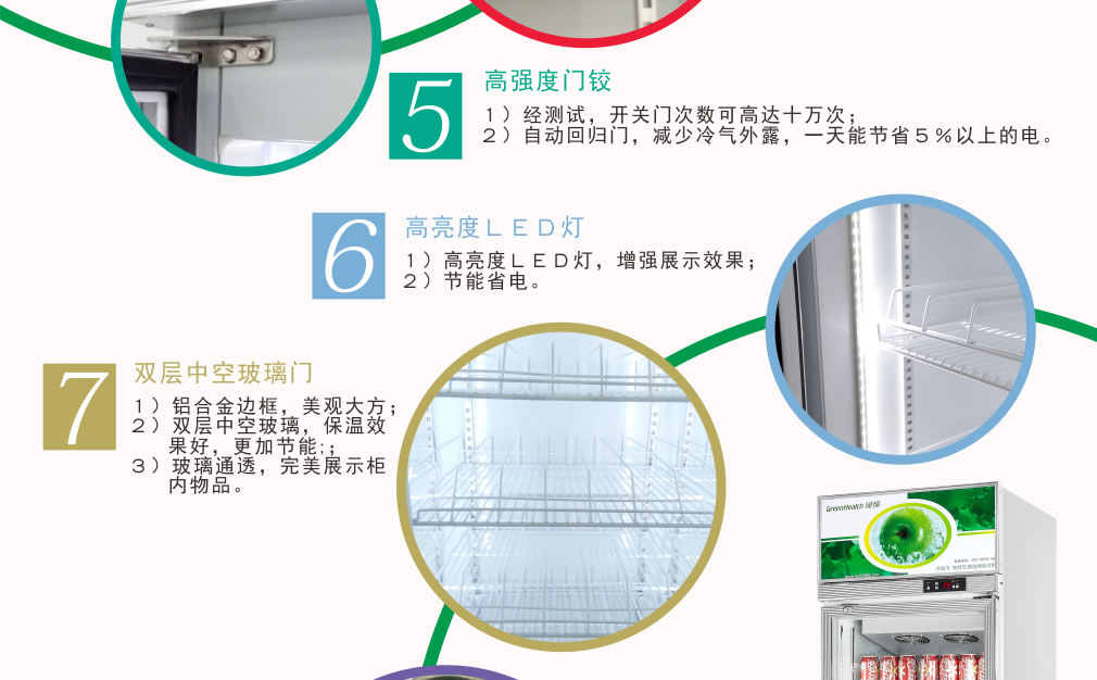 全封閉門封,不銹鋼層架勾,微電腦溫控器,EBM冷風(fēng)機(jī),高強(qiáng)度門鉸,高亮度LED燈,雙層中空玻璃門,360度旋轉(zhuǎn)輪,純鋼管翅片式蒸發(fā)器,翅片式冷凝器