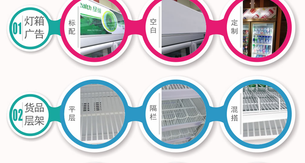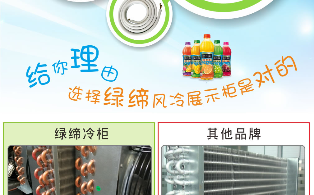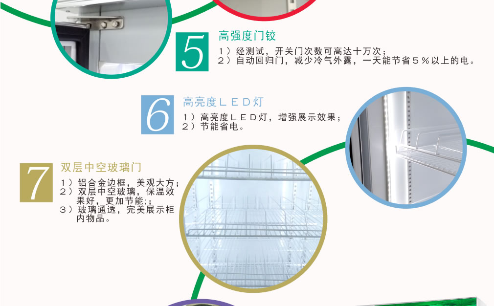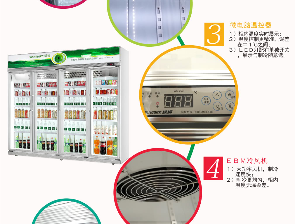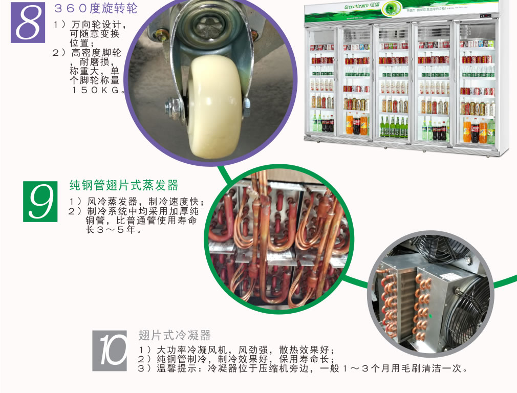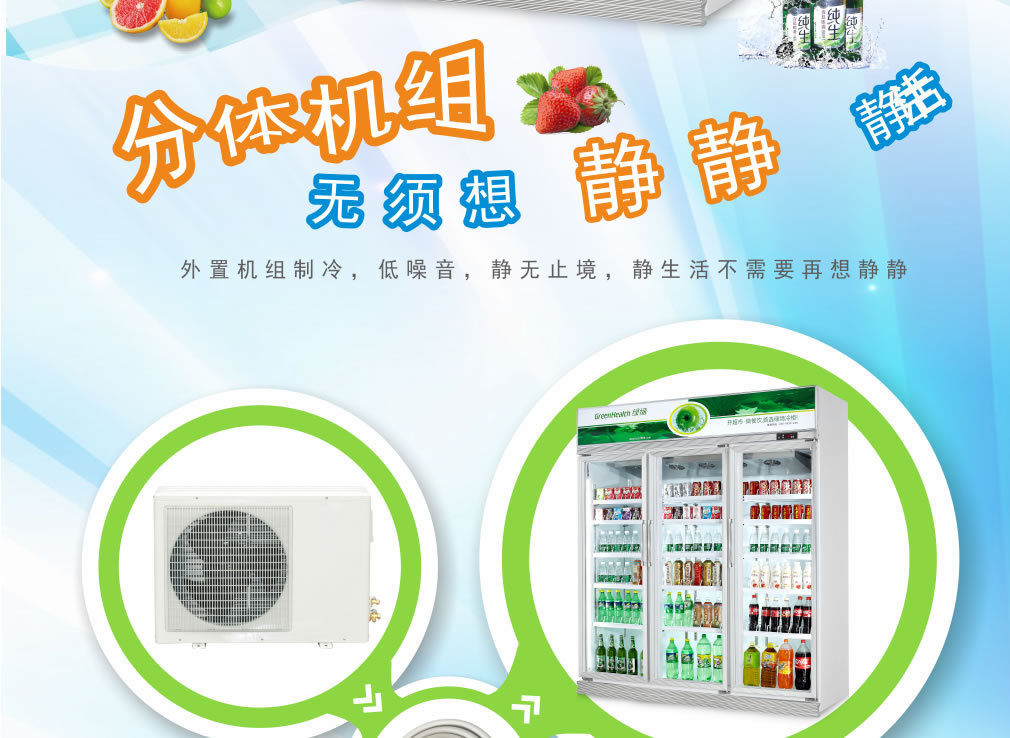 分體機(jī)組低澡音全封閉門封,不銹鋼層架勾,微電腦溫控器,EBM冷風(fēng)機(jī),高強(qiáng)度門鉸,高亮度LED燈,雙層中空玻璃門,360度旋轉(zhuǎn)輪,純鋼管翅片式蒸發(fā)器,翅片式冷凝器