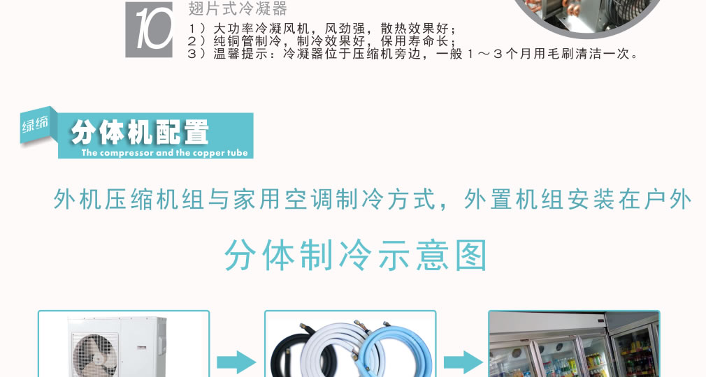 ③ 選擇平整地面放置冷柜,背部離墻保持15~20CM,方便于機(jī)組通風(fēng)散熱;